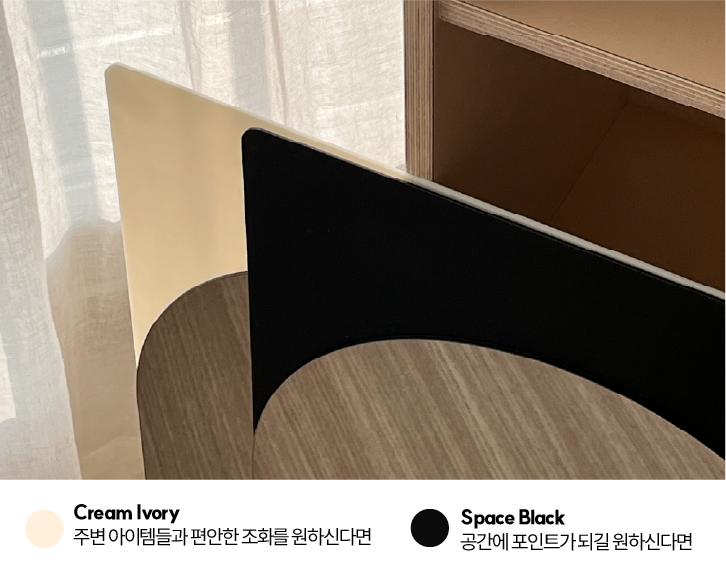 잘 압니다. 아이의 공간에 들어갈 소품 하나도 취향껏 고르고 배치했을 엄마 아빠들의 마음을요. 그래서 컬러 선정에 심혈을 기울였습니다. 주변 아이템들과의 편안한 조화를 위한 Cream Ivory와 공간의 감각적 포인트가 될 Space Black. 두 컬러로 준비했습니다.