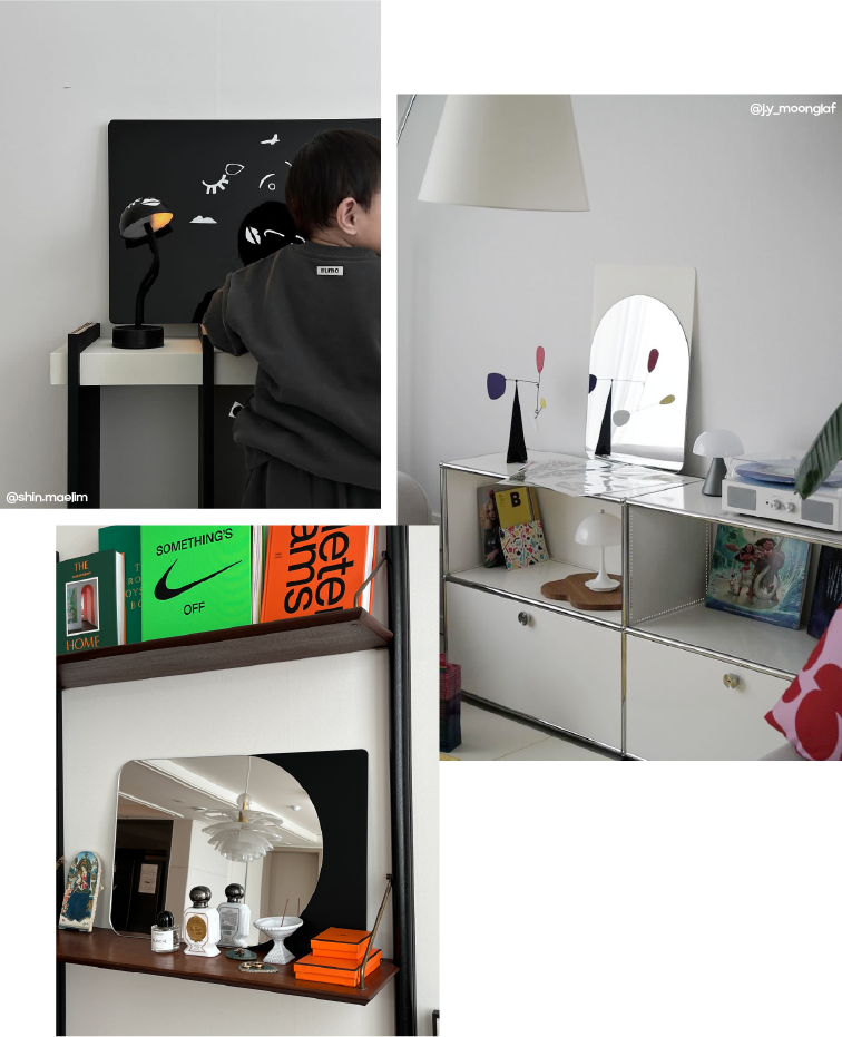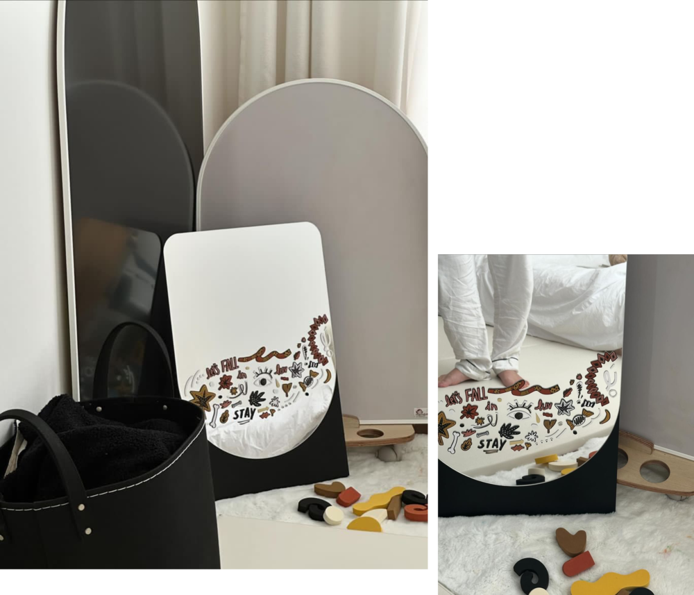 다른 거울들은 방향이 고정된 디자인이라 불편하셨었나요? 제로마일아트의 아트 스케이프는 정해진 방향이 없습니다. 여러분의 공간과 아크릴 미러의 쓰임에 있어 고민을 덜어드리기 위함이었습니다. 아이 공간의 오브제로서도, 거울 셀카를 위한 홈 스튜디오로서도, 홈문센 활용에 있어서도 방향에 제약을 두지 마세요. 언제든 방향을 바꿔가며 찍고, 놀고, 두세요.