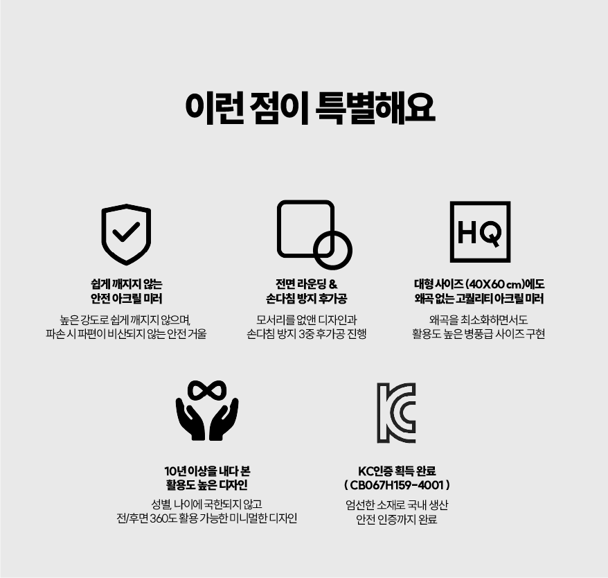 아크릴 거울의 가장 큰 불편이 어딘가에 반드시 붙여서 사용해야 한다는 점이었어요. 그러나 육아 환경에서 비어있으면서 마음껏 무언가를 부착할 수 있는 벽은 많지 않잖아요. 그래서, 1) 거치해서 사용할 수 있을 만큼 탄탄하면서 2) 벽에 부착할 때도 부담 없는 무게 3) 여기 저기 옮겨 다니며 사용할 수 있는 가벼움 모두를 만족하는 최상의 조건을 찾기 위해 노력했습니다. 마음 껏 편하게 사용하세요.