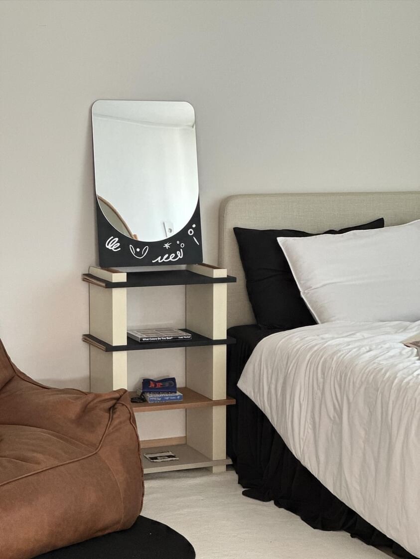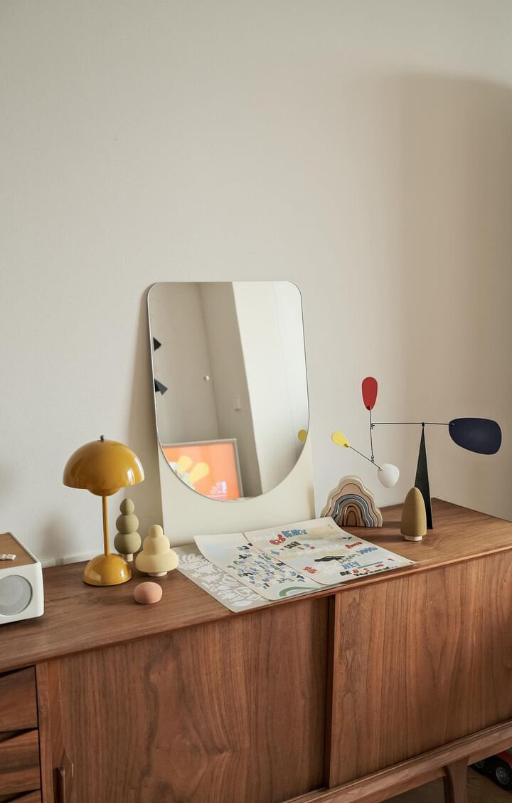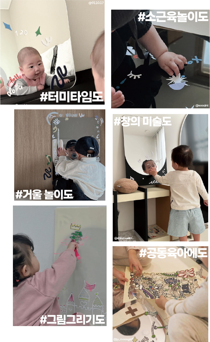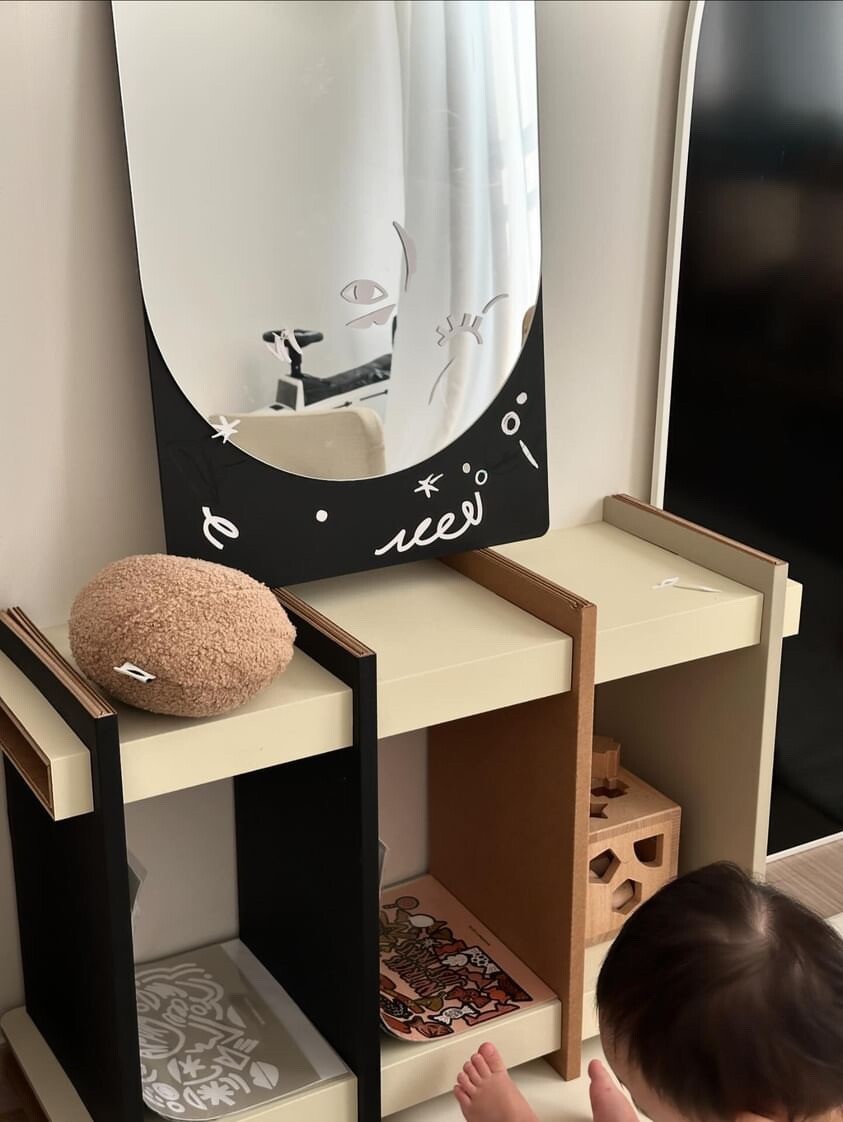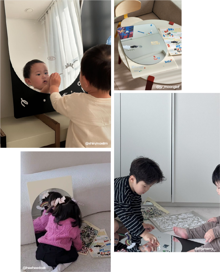 아이의 안전도 발달도 고려하면서도 10년 이상은 거뜬이 사용할 수 있는 높은 사용성을 갖출 순 없을까? 그리고 엄마 아빠의 감각에도 딱 맞는 미니멀한 디자인을 갖춘 건 없을까? 그 거울을 더 활용할 수 있는 방법은 없을까? 그 질문의 답을 찾았어요. 바로, 이렇게요.