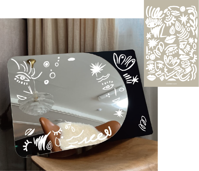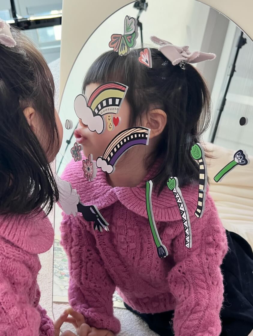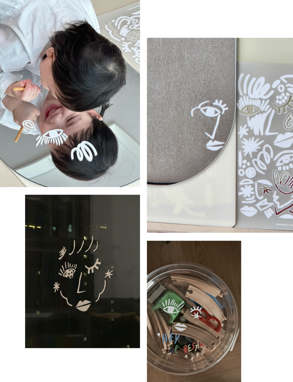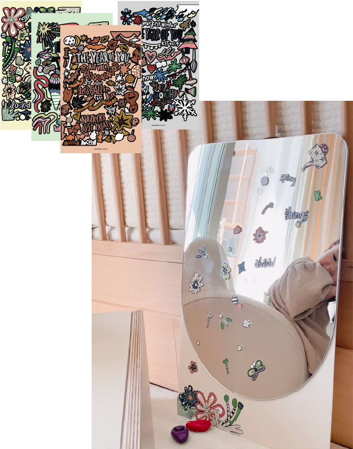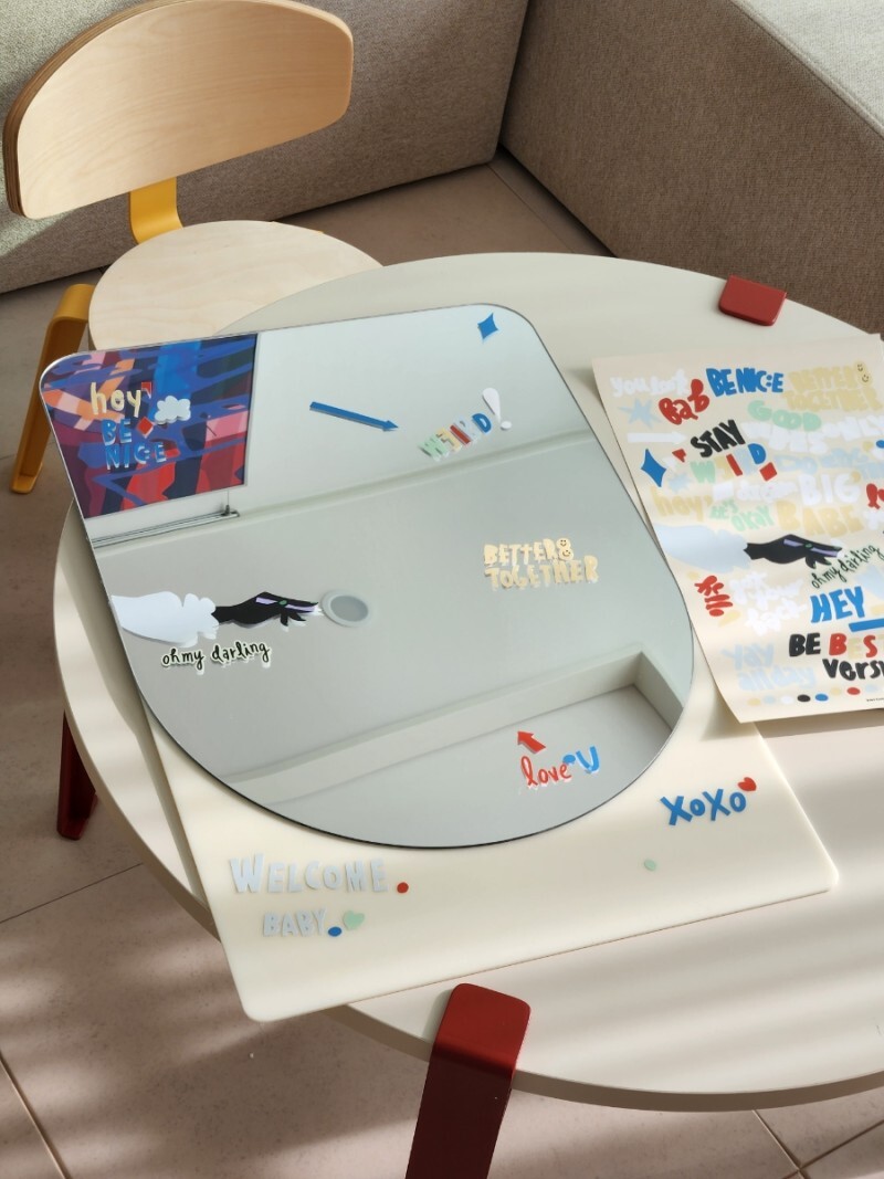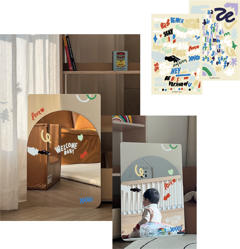 아트 감성으로 디자인된 스티커로 거울을 자유롭게 데코하며 아이는 아트 경험을 할 수 있고, 예쁘게 데코된 거울은 툭 두는 것만으로도 공간에 아트 감성을 더할 수 있는 에센셜 키트. 아이가 생활하는 공간에서 아트 경험과 감성을 동시에 전달할 수 있도록 고안했어요.