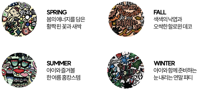 봄, 여름, 가을, 겨울. 뚜렷한 4가지 계절을 아이에게 이야기해주고 싶은데 생각보다 보면서 나눌 무언가들이 없죠? YEAR OF YOU는 그런 엄마들의 마음을 담아 아이와 함께 4계절을 함께 즐겨볼 수 있도록 계절 마다의 특색 있는 아이템과 소재를 활용해 스티커로 만들었어요. 집안 곳곳 어디든 쉽게 붙였다 떼어보면서 집 밖의 4계절의 느낌을 집 안으로도 들여보세요.