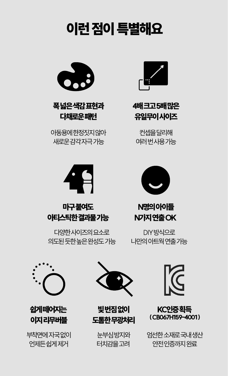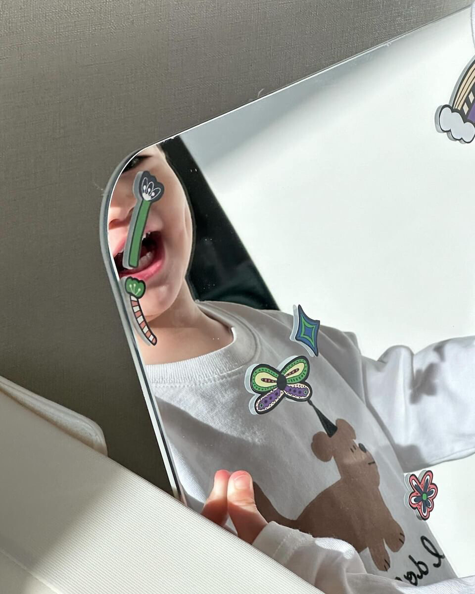 아이에게 무언가 새로운 놀이가 필요한데 그럴 때마다 외출은 힘들잖아요. 이젠 집에서도 소근육 발달, 인지 발달은 물론 창의력 발달에도 도움이 되는 아트 놀이로 활용해보세요. 아이들 놀이 전 딱 1분! 거울과 스티커만 딱 꺼내두시면 됩니다. 아, 물론 다른 장난감들처럼 수납이 번거롭지도 공간을 많이 차지하지도 않으실 거에요. 거울은 그저 아이들 공간에 데코해두시면 되고 스티커는 아주 간편하게 수납하실 수 있으실 테니까요.