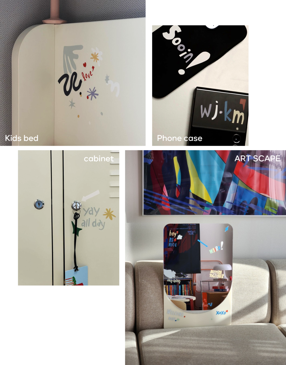 리무버블 스티커라는 점 잊지 않으셨죠? 언제든 쉽게 붙이고 흔적 없이 떼어낼 수 있으니 부담 갖지 마시고 마음껏 시도해보세요. 아이의 가구 (아트 스케이프, 침대, 책장, 매트 위 등), 아이와 함께 하는 폰꾸, 어린이집에 보내는 물병, 파우치 등 어디든 꾸며보세요. 생활 방수도 가능하니 걱정 마시구요.