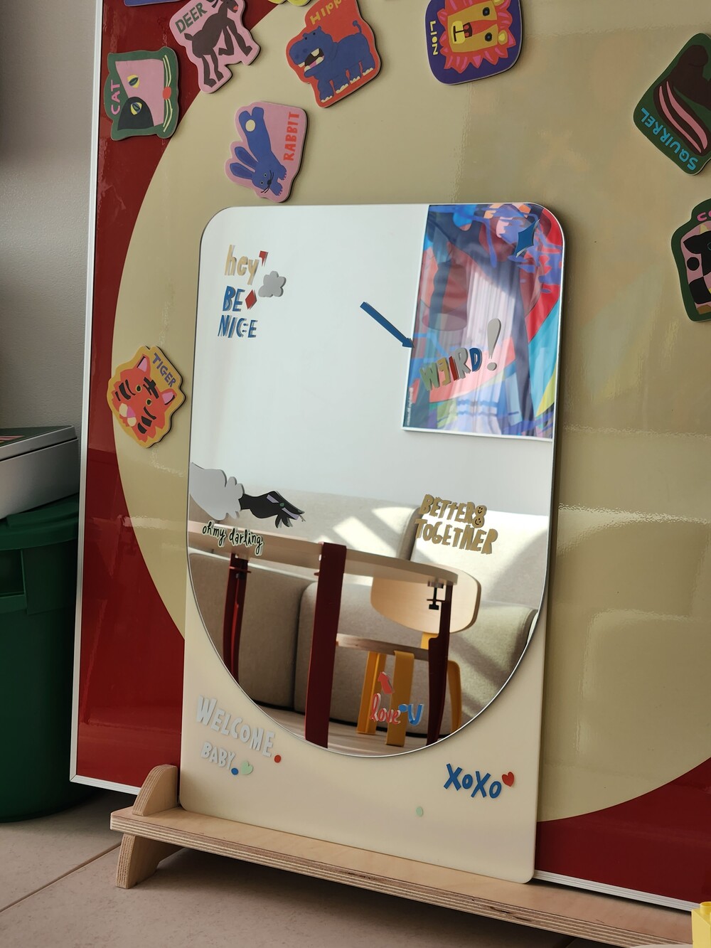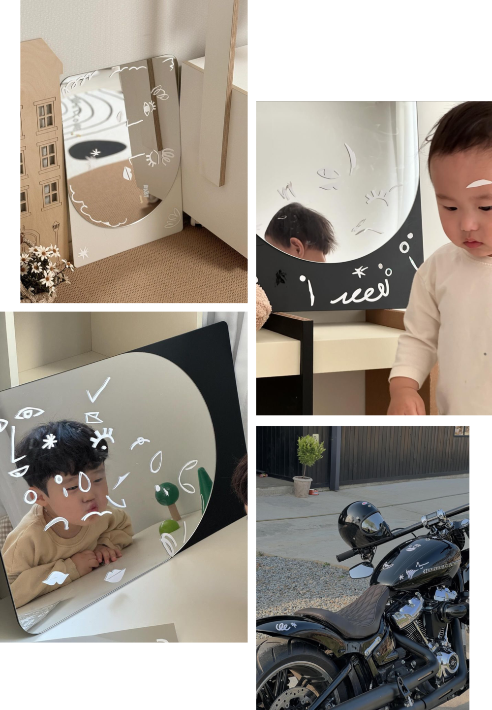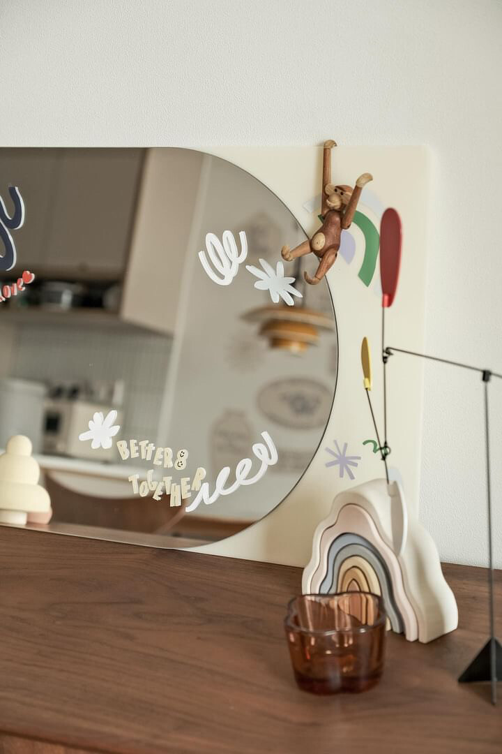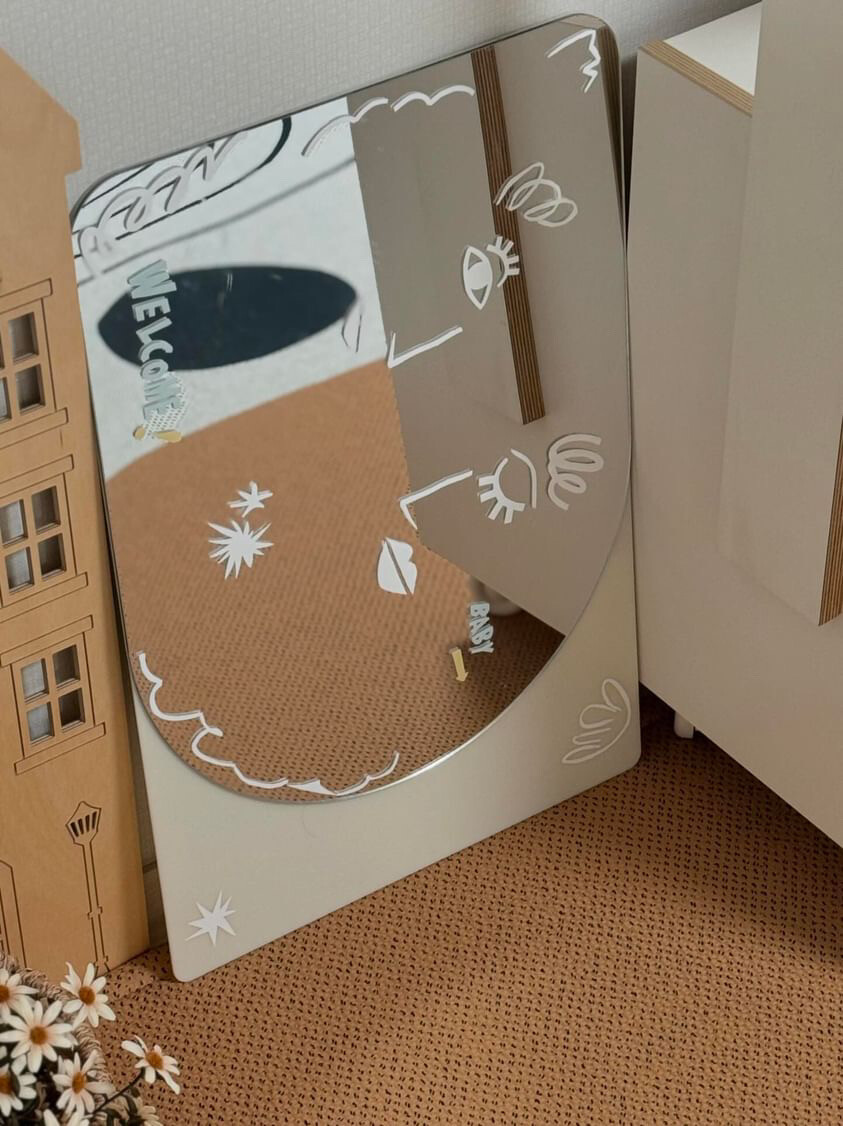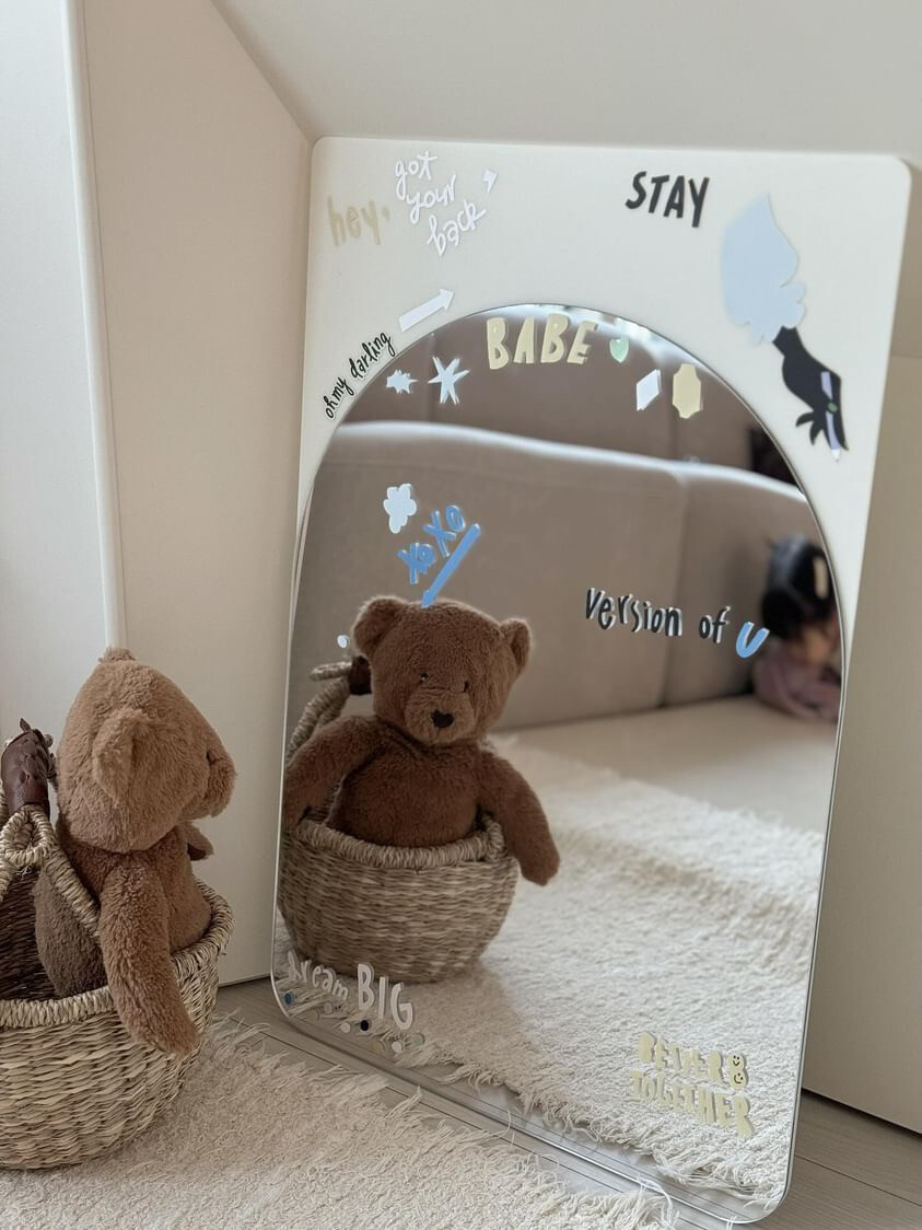 안전 거울이라고만 생각하셨나요? 뒤를 보세요. 거울이 있는 면과 달리 뒷면은 유광의 아크릴로 마감이 되어 활용도를 높였습니다. 때로는 칠판이, 때로는 축하 보드가, 때로는 우리 가족의 사진을 담은 포토월이 된답니다. 아이가 자라면 to do list를 기록하는 보드로도 활용해보세요.