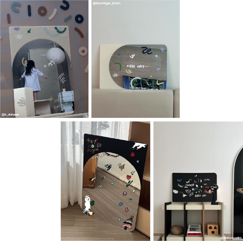 안전 거울이라고만 생각하셨나요? 뒤를 보세요. 거울이 있는 면과 달리 뒷면은 유광의 아크릴로 마감이 되어 활용도를 높였습니다. 때로는 칠판이, 때로는 축하 보드가, 때로는 우리 가족의 사진을 담은 포토월이 된답니다. 아이가 자라면 to do list를 기록하는 보드로도 활용해보세요.