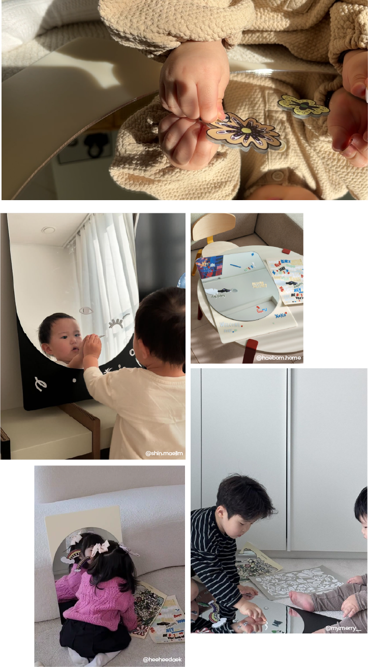 필요에 따라 구입하고 버려지는 일회용 의상, 소품 등이 많으시죠? 비싼 비용을 줬음에도 결국 남는 건 인스타용 사진 몇 장 뿐이라 아쉬우셨죠? 저희는 사진 한 장에 용도를 다하고 싶지는 않았어요. 거울 앞에서 세상을 보던 아기가 어느 덧 뒷면의 보드를 이용해 메모하고 공부하는 모습도 보실 수 있도록더 나아가 엄마 아빠의 공간에 둘만큼 탐나는 디자인으로 준비했어요.