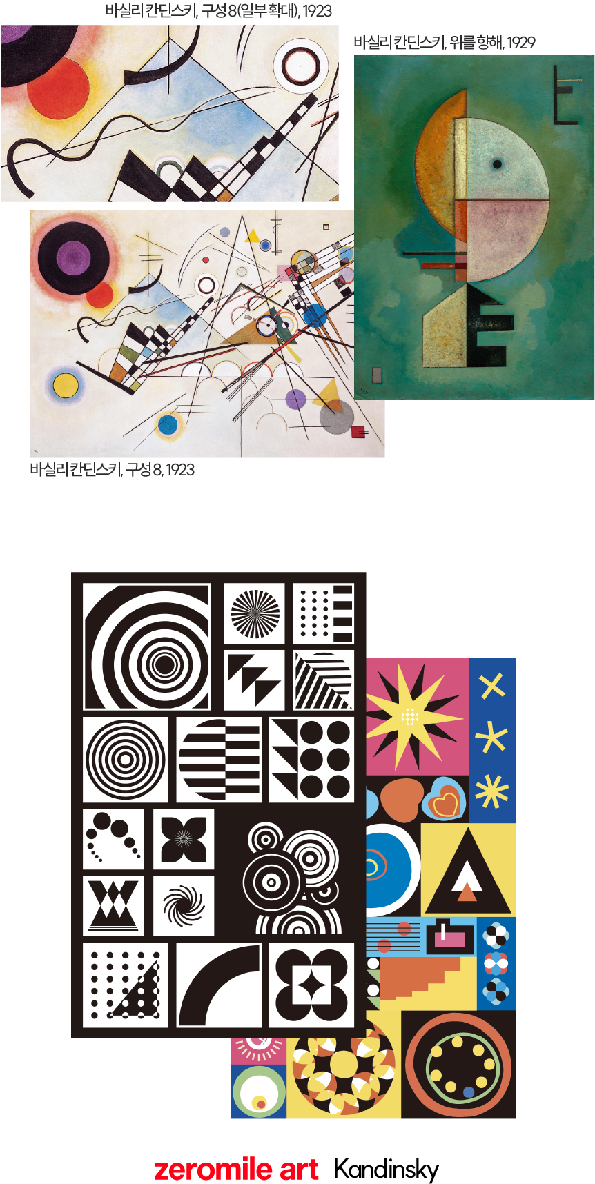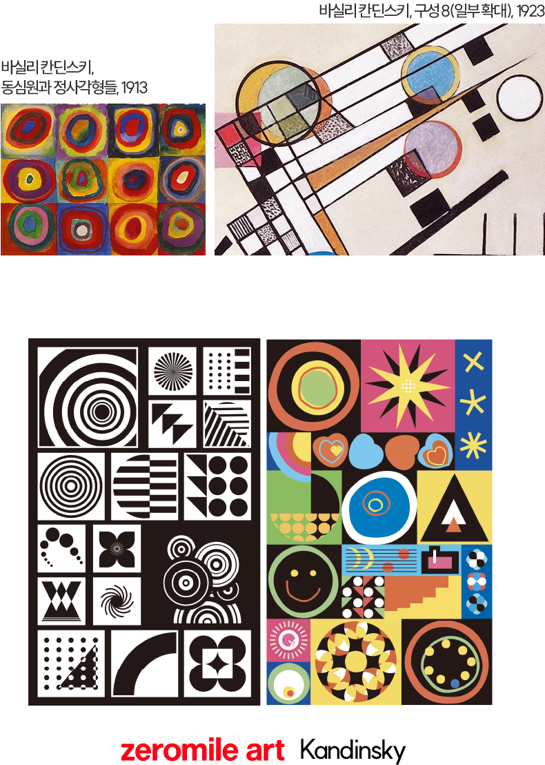 점, 선, 면 그리고 원이 펼쳐내는 칸딘스키의 무한한 지오메트리의 향연. 3세 이전 아이들에게 익숙할 별, 달, 꽃, 하트등의 현대적 형태와 비정형의 드로잉을 조합해 새롭게 해석해 봤어요.