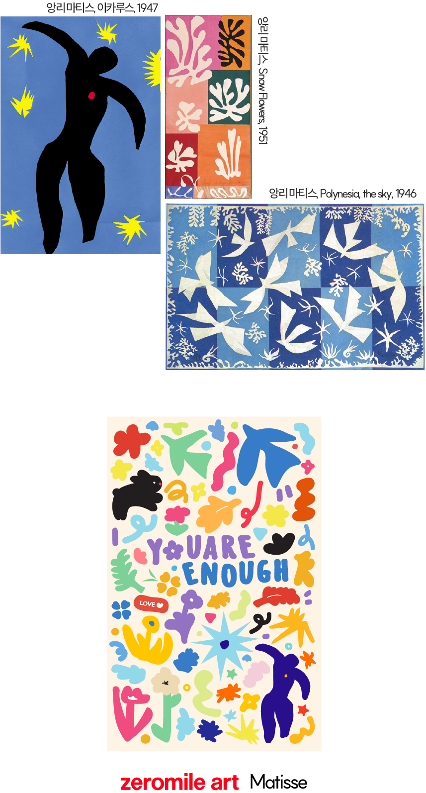 행복을 그린 화가, 컷 아웃의 대가로 친숙한 마티스. 그의 작품을 대표하는 요소들을 따로 또 같이 모은 콜렉션입니다. 자유롭게 펼쳤던 마티스의 무한한 상상력을 또 다시 한번 나만의 감각으로 [새탄생] 시켜보는 그런 경험을 우리 아이들과 나누고 싶었어요.